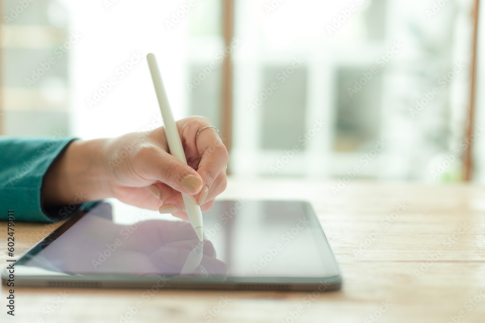 Close up image of a woman is using stylus pen and empty screen tablet at the wooden table.