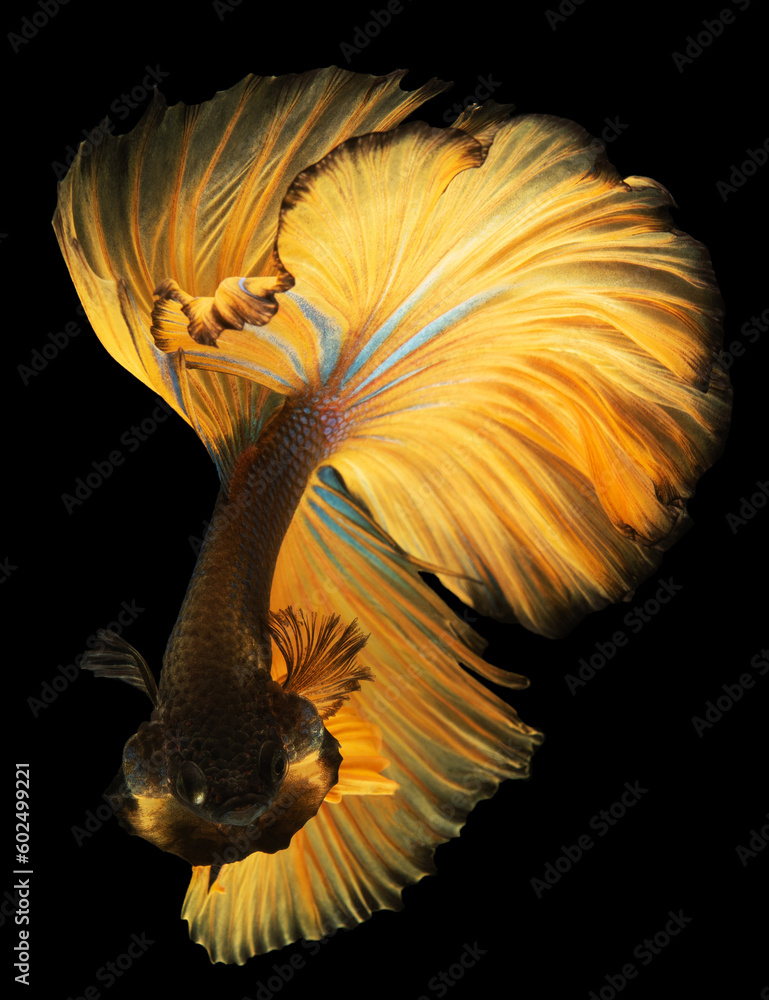 The golden tailed betta fish gracefully glides through the water its vibrant tail shimmering like rays of sunlight casting a mesmerizing golden glow.