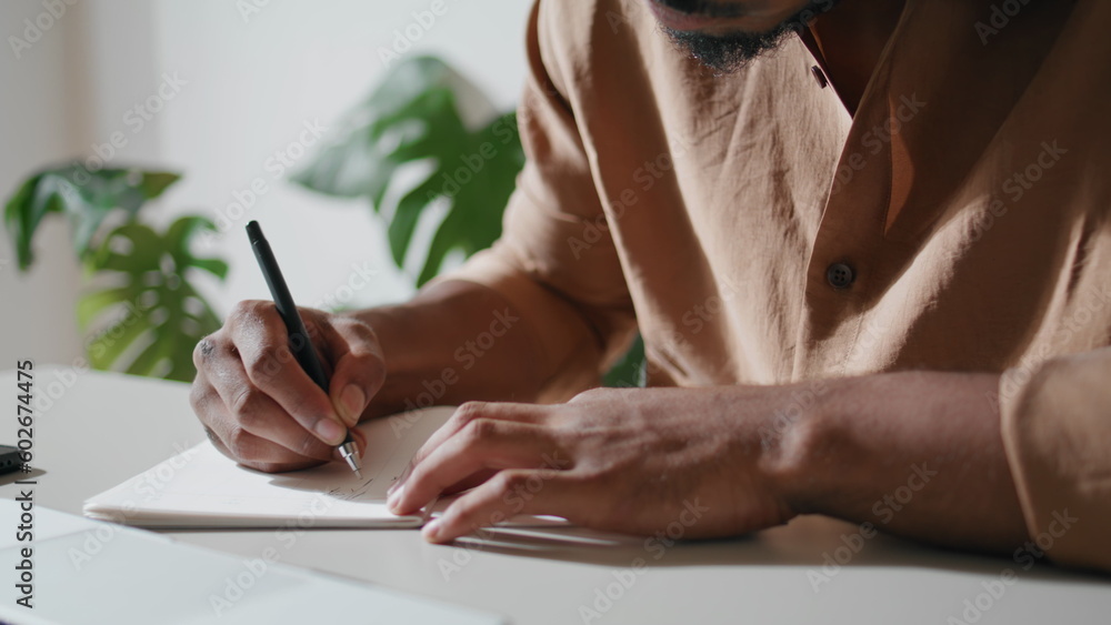 Man hands writing notebook closeup. Unrecognizable guy making notes at home