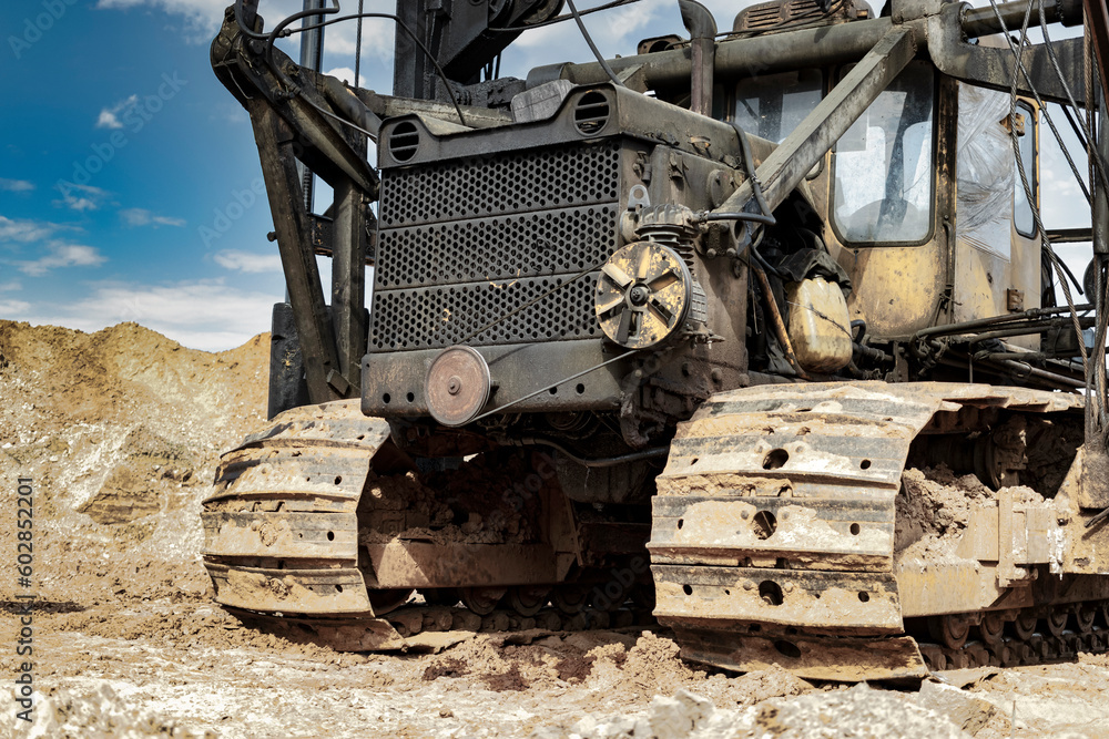 Pile driving machine. Diesel hammer pile driving machine working on construction site. Preparation of the pile foundation for the construction of the building. Close-up.