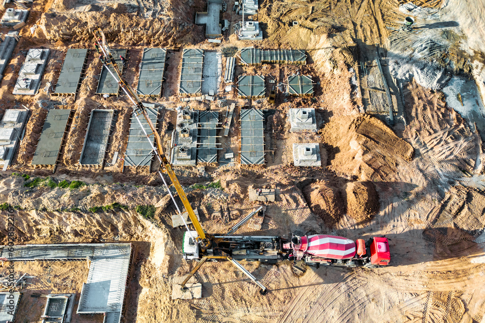 Arm of concrete pump ready for concrete conveying at construction site. Jib of concrete pump truck against sky at background. Truck Mounted Concrete Pump. View from above.