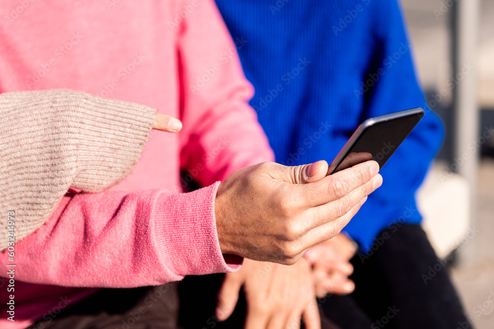 close up of a hand holding a mobile phone sharing a moment with friends, concept of technology of communication and connectivity in a digital world