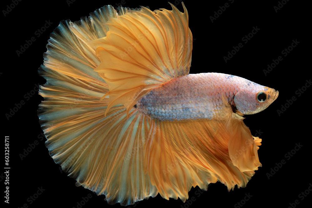 Black background enhances the luminosity of the yellow betta fish showcasing its beauty and elegance.