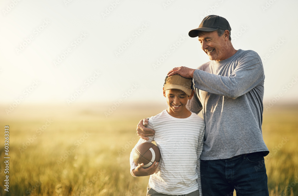 Father, son and rugby ball in a countryside field for bonding and fun in nature. Mockup, dad and young child together with happiness and smile ready to start American football game outdoor on farm