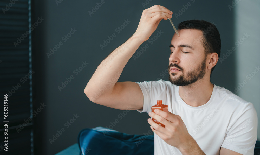 Young man applying serum to his face with a dropper serum treatment, closing eyes enjoying skincare procedure. Man hygiene. Therapy treatment, beauty skin care