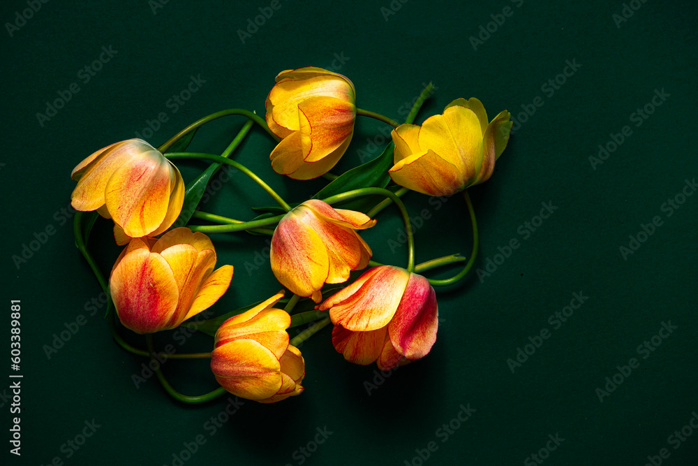 Yellow-Red Flowers - Tulips on a Dark Green Background. Minimalistic Floral Modern Concept. A Bouquet of Spring Flowers, Randomly laid out, Top view. Copy Space. Flower layout. Poster. Art