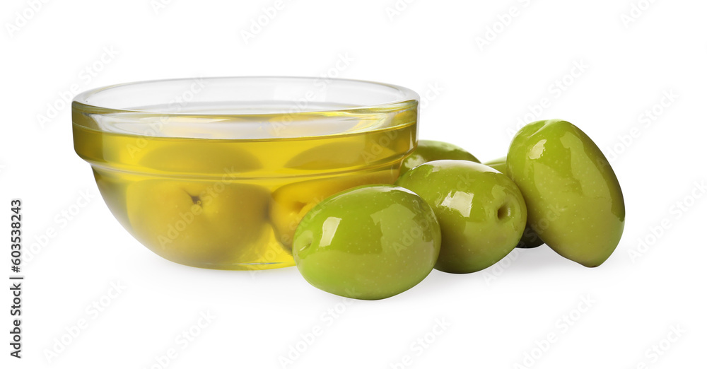 Cooking oil in glass bowl and olives on white background