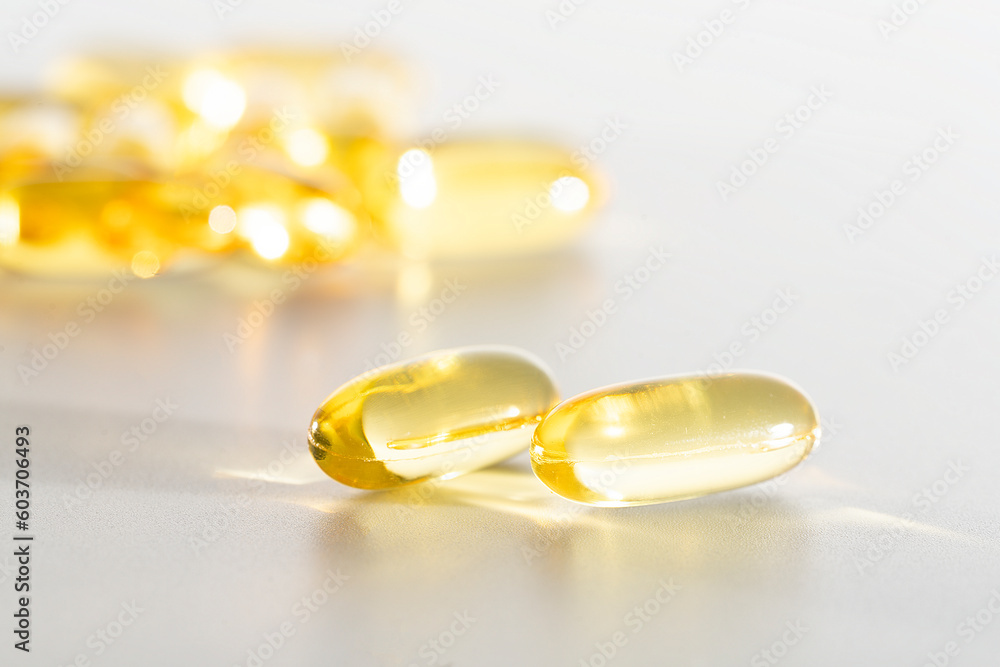 Fish Oil Omega 3 on white background, vitamin D yellow supplement gel capsules, macro shot
