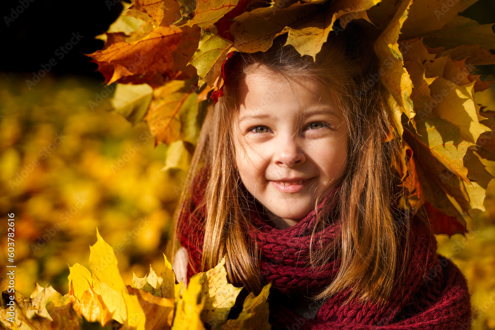 Beautiful little girl in bright yellow orange autumn warm knitted hat and scarf snood with bouquet of maple leaves,foliage walking in forest. Fun playing in park. Outdoor family activity in nature