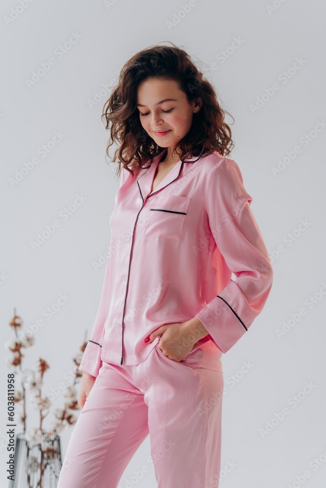 Stylish curly woman wearing pink silk pijama.