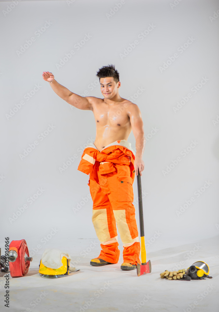The professional firefighter stands topless on a white background with one hand holding an iron axe and the other hand lodge by his side while wearing a smile on his face.