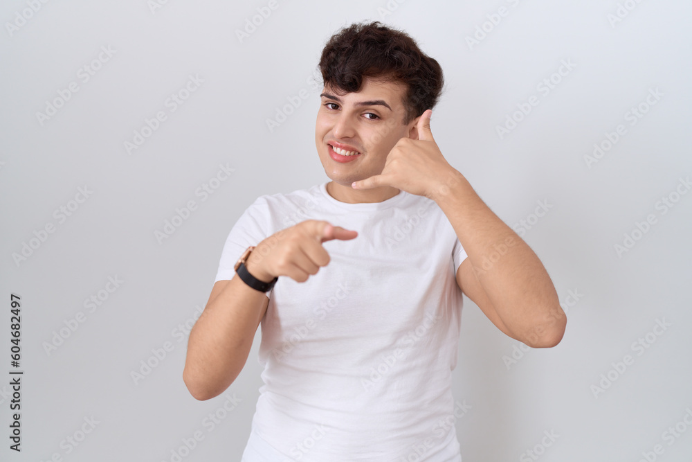 Young non binary man wearing casual white t shirt smiling doing talking on the telephone gesture and pointing to you. call me.