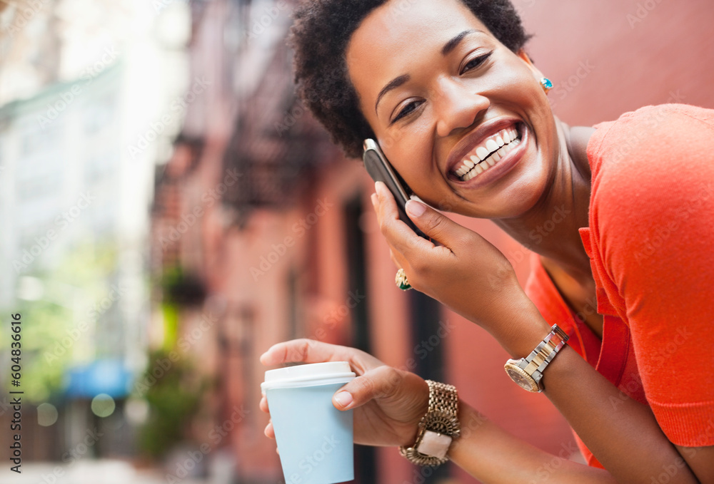 Woman on cell phone on city street