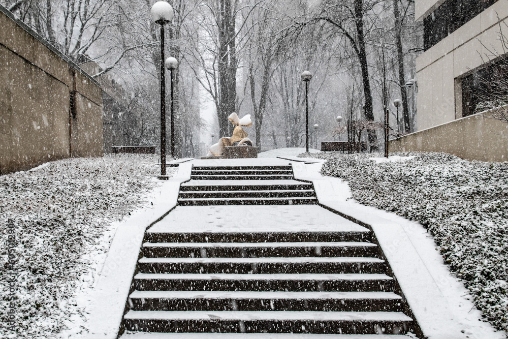 Snowy Trail and Staircase Leading to Pettygrove Park in Downtown Portland, OR