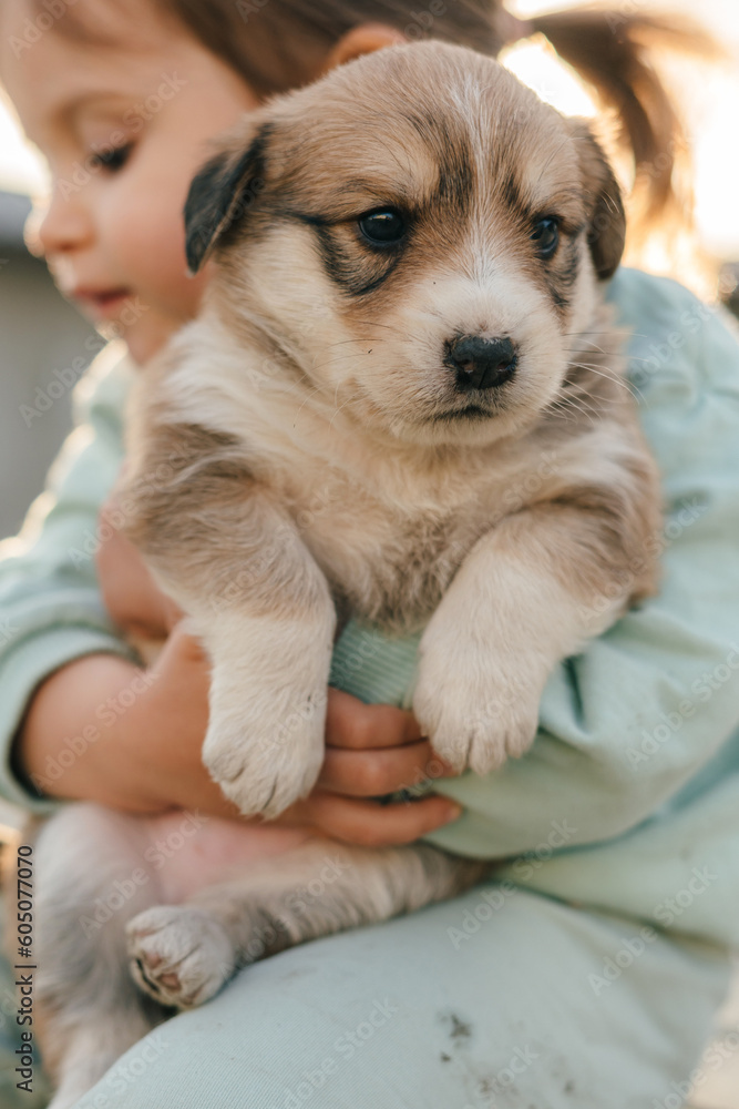 Funny photo of happy baby cuddling puppy playing with dog oitdoors. Family lifestyle, positive emotions of children fun games with home pet on summer vacation.