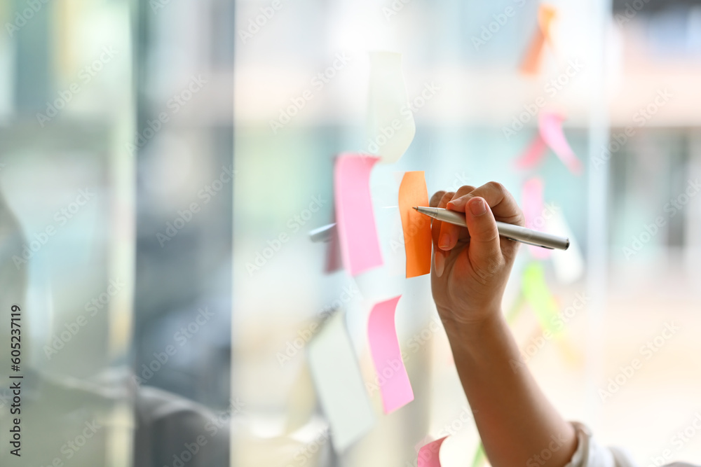 Select focus on hand of female employee writing tasks, new ideas planning corporate strategy creation on sticky notes in office