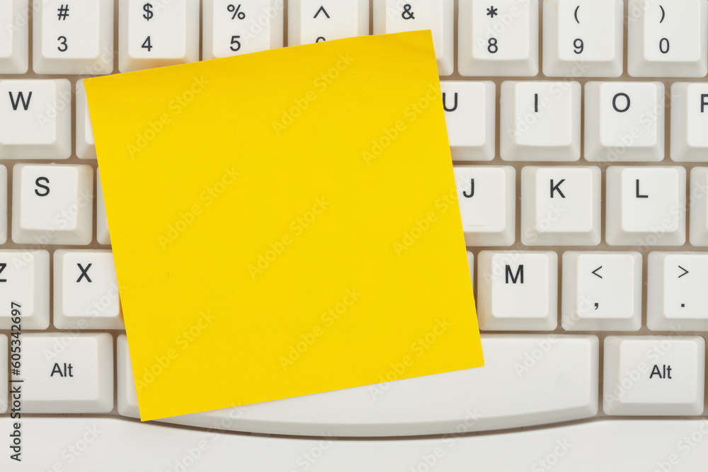 Blank yellow sticky note on a gray computer keyboard