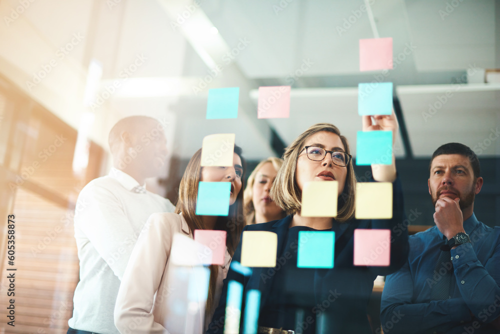 Business people, brainstorming and collaboration on glass for schedule, calendar and planning goals. Woman, manager and mentor of ideas at window for sticky note feedback, agenda and timeline