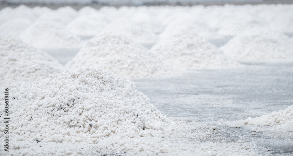 Sea salt farm. Pile of brine salt. Raw material of salt industrial. Sodium Chloride mineral. Evaporation and crystallization of sea water. White salt harvesting. Agriculture industry. Traditional farm