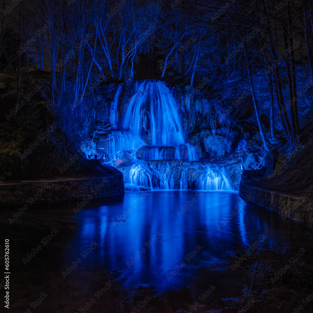 illuminated waterfall Lucky with blue light at night. Slovakia