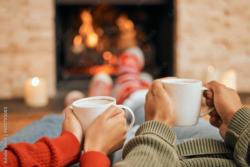 Hands, coffee and couple relax by fireplace, bonding and cozy in home together. Tea, man and woman relaxing by fire on Christmas holiday in winter, heat and enjoying quality time with drinks in house