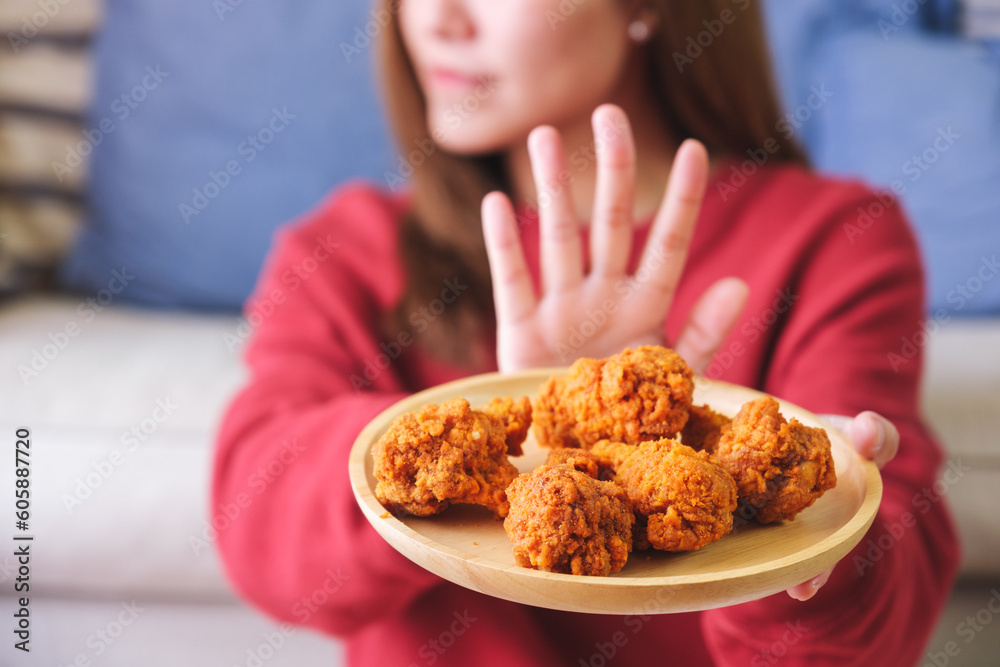 Closeup of a woman making hand sign to refuse fried chicken for dieting and healthy eating concept