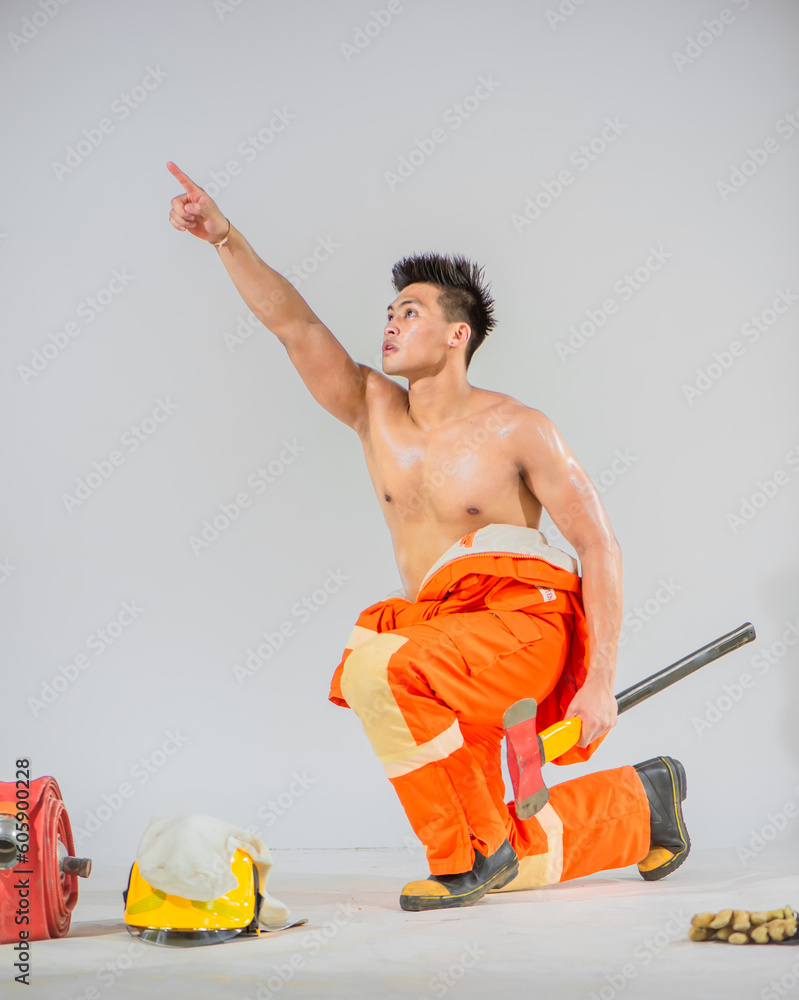 Professional firefighter is sitting and kneeling down topless with one hand holding an iron axe and the other hand pointing upwards while looking upwards on a white background.