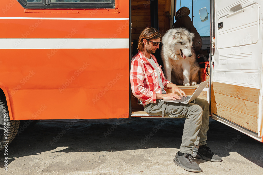 Full body of happy adult male freelancer in casual clothes and sunglasses smiling while working remotely on laptop sitting on van step near curious Alaskan Malamute dog during road trip