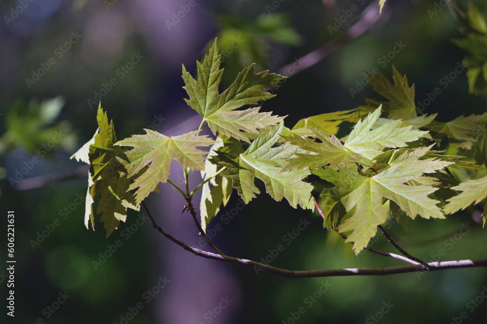 Young green leaves on a tree branch under the rays of the spring sun, green background, selective focus