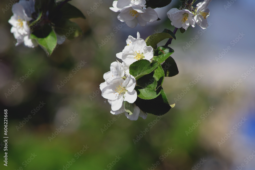 beautiful flowers on a branch of an apple tree against the background of a blurred garden