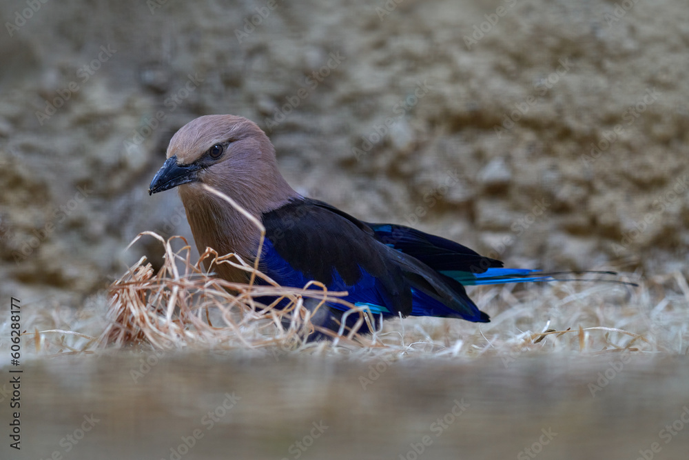 Blue-bellied roller, Coracias cyanogaster, Gambia in Africa. Bird in the nature habitat. Wild bird from Senegal in Africa. Beautiful bird with white head sitting on the tree trunk in the forest.