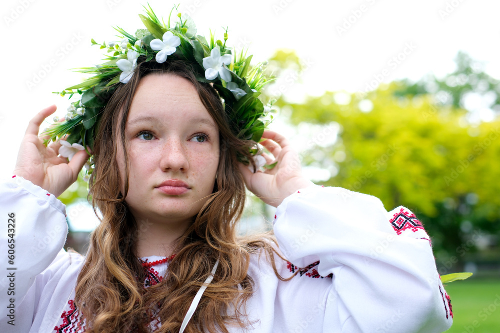 Mavka water nymph naiad near water in nature forest on the river bank of the lake on a quarry on a cliff in a brown orange dress with a wreath on her head and candles in her hands Ivan Kupala