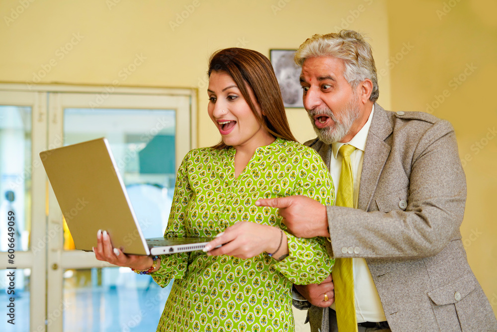 Senior businessman giving happy expression after looking in laptop with female colleague.