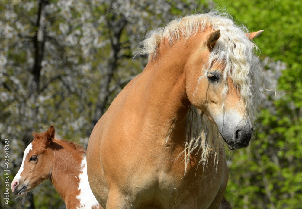 Frühling auf der Pferdeweide. Haflingerstute mit geschecktem Fohlen im blühendem Obstgarten