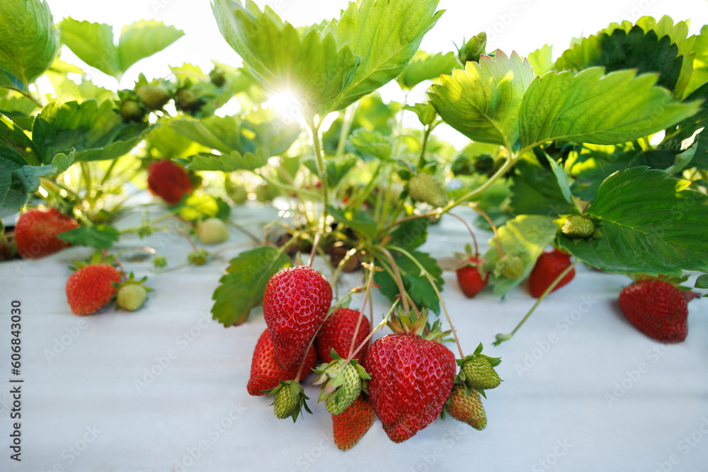 Bush of ripe organic strawberries in the garden. Berry close-up.