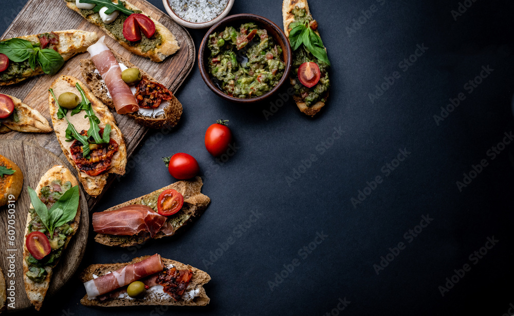 Set of bruschettas with jamon, olives, pesto, tomatoes, basil and mozzarella served on wooden board with guacamole and cherries. Traditional mediterranean antipasti food composition with copy space