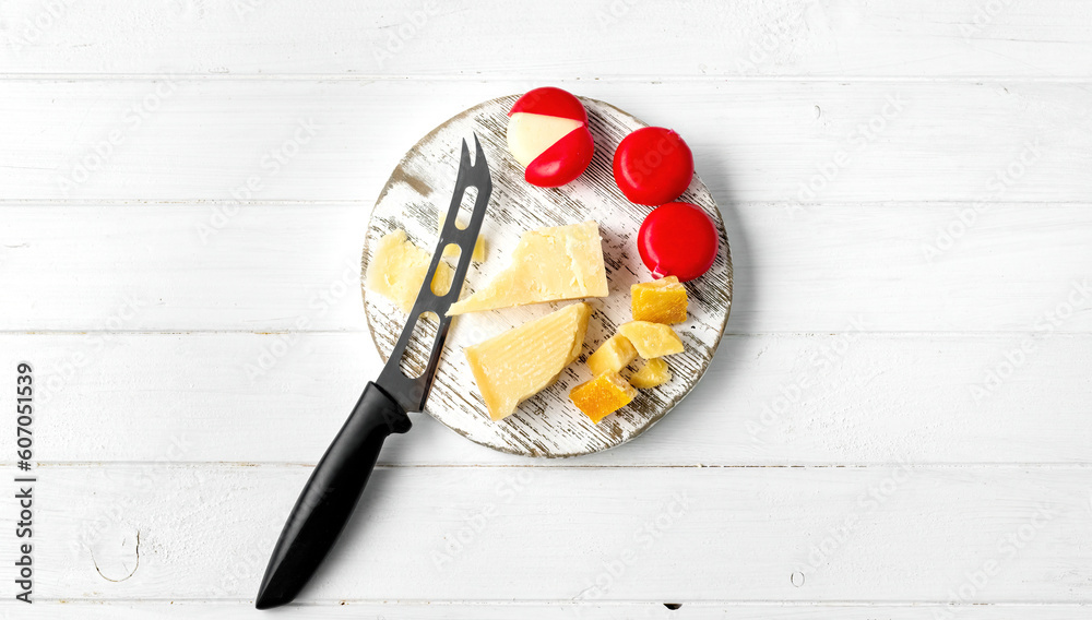Italian cheese parmesan on plate with knife and other delicatessen. Delicious snack appetizer with protein
