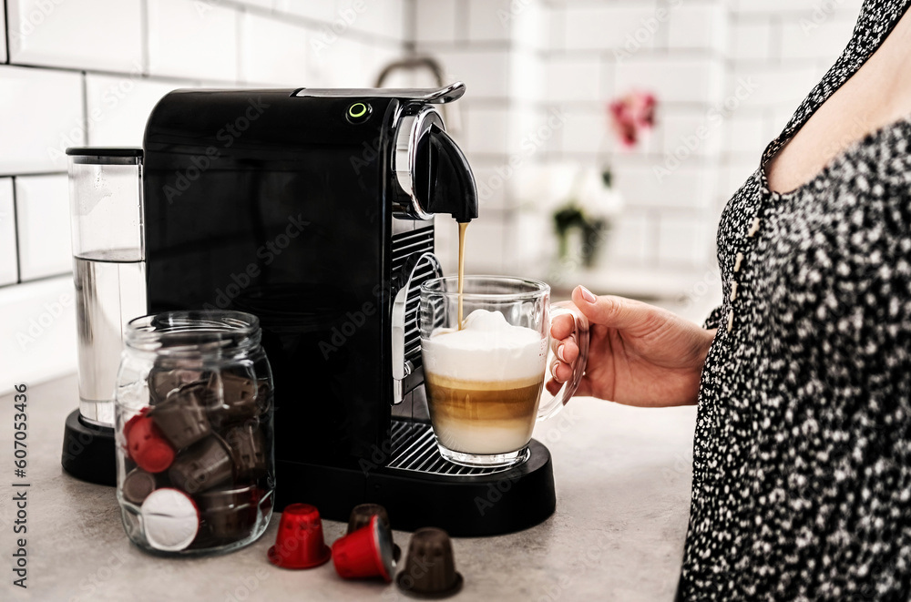 Girl with capsule coffee machine and cappuccino in transparent cup at kitchen. Woman preparing italian caffeine beverage using professional espresso maker
