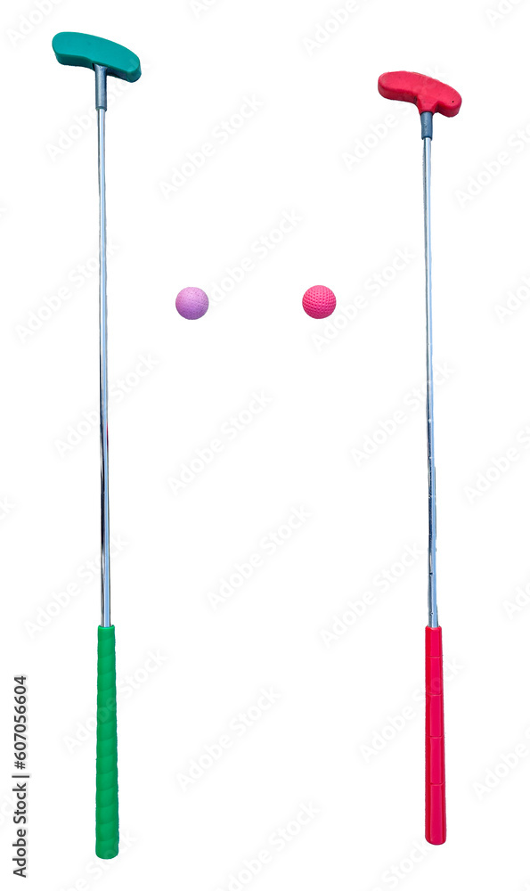 Minigolf putters in different sices with balls isolated on white background / Mini Golf Material / Mini golf clubs with balls isolated