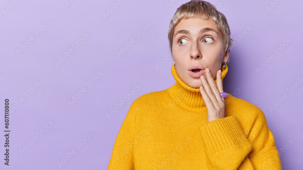 Horizontal shot of impressed short haired woman keeps mouth widely opened reacts to something shocking dressed in yellow sweater poses against purple background copy space for your promotional content