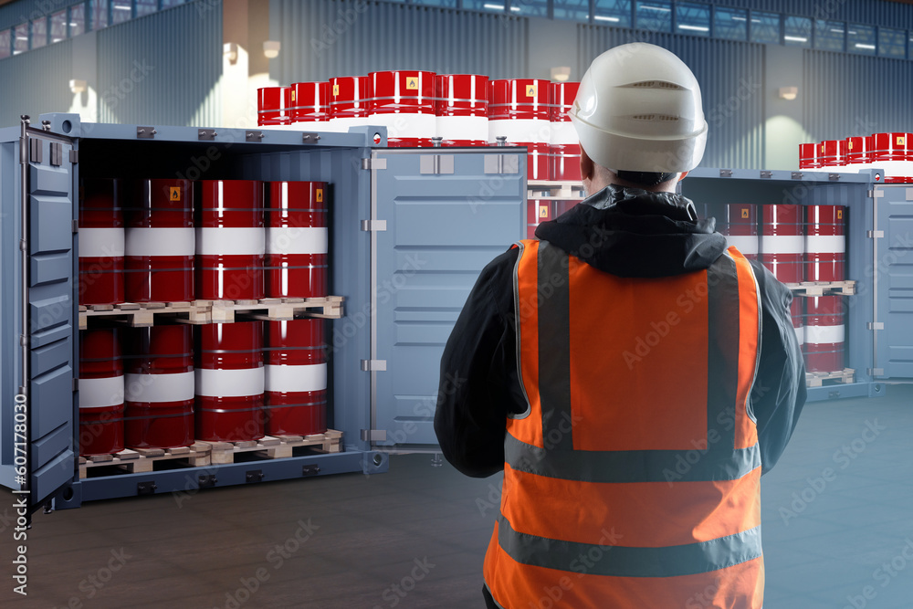 Warehouse enterprise. Container with red barrels. Man in orange vest with his back to camera. Barrels with chemicals on pallets. Chemical tanks are ready for transport or storage. Warehouse employee