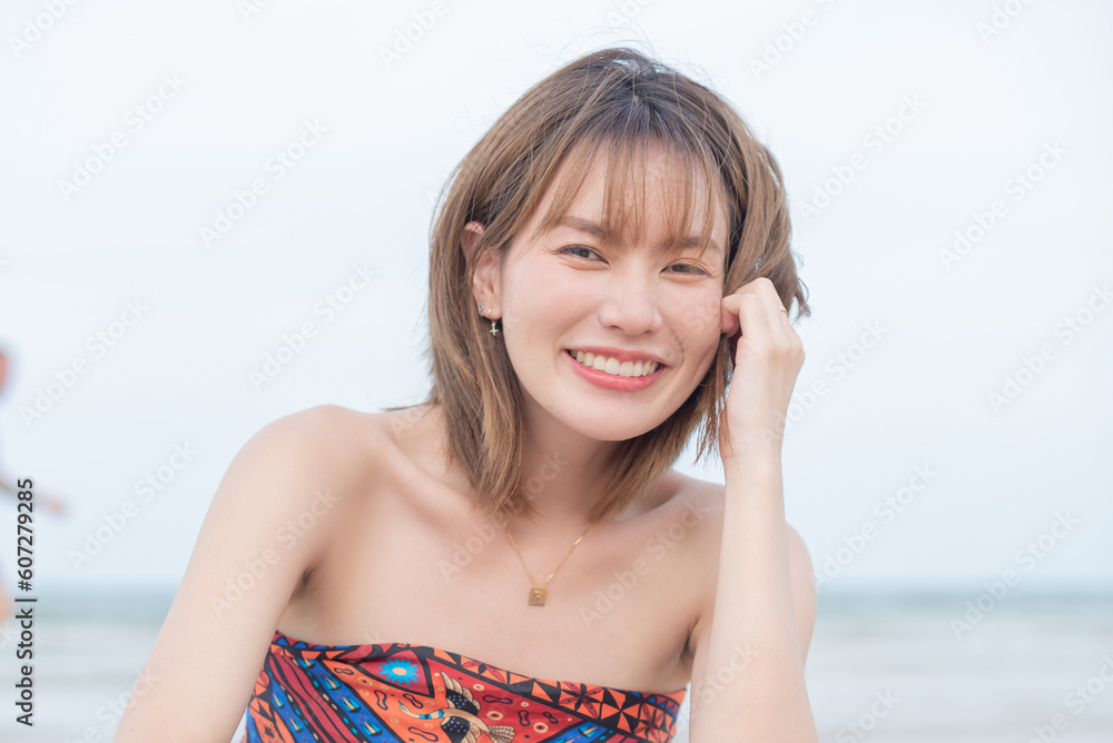 young slim beautiful woman on sunset beach, playful, summer vacation, sunny, having fun, positive mood, romantic, traveller, happy, Happy mixed race girl in casual outfit with wind in her hair.