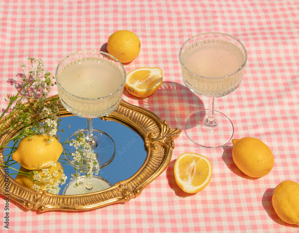 Summer creative layout with vintage mirror with sky reflection, lemons and glasses on pink plaid background. 80s or 90s retro aesthetic idea. Minimal summer fruit coctail idea.