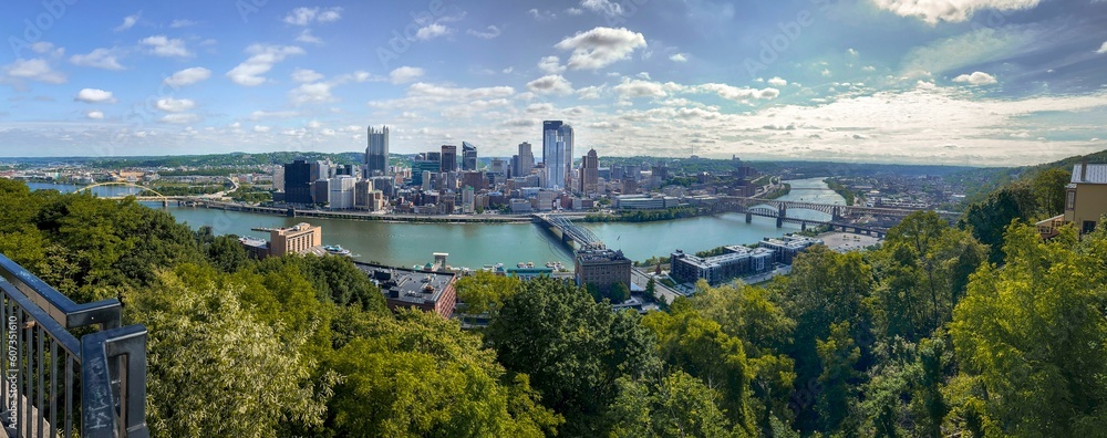 Aerial view of Downtown Pittsburgh with Mount Washington at the top of the Duquesne incline