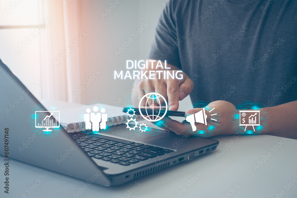 Digital marketing media internet advertising and sales increase business technology concept in virtual screen. Businessman working smartphone with keyboard and laptop at office in morning light.