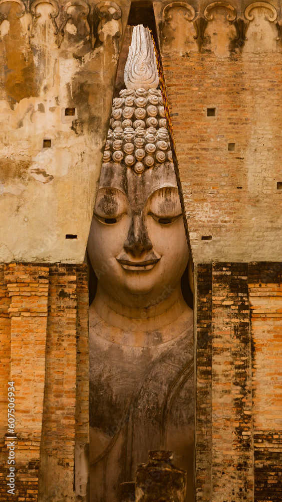 Giant statue of seated Buddha in mara mudra position, enveloped in an atmosphere of silence and mysticism, at Wat Si Chum temple, in the Sukhothai region, Thailand, Southeast Asia