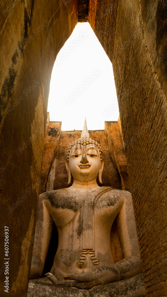 Giant statue of seated Buddha in mara mudra position, enveloped in an atmosphere of silence and mysticism, at Wat Si Chum temple, in the Sukhothai region, Thailand, Southeast Asia