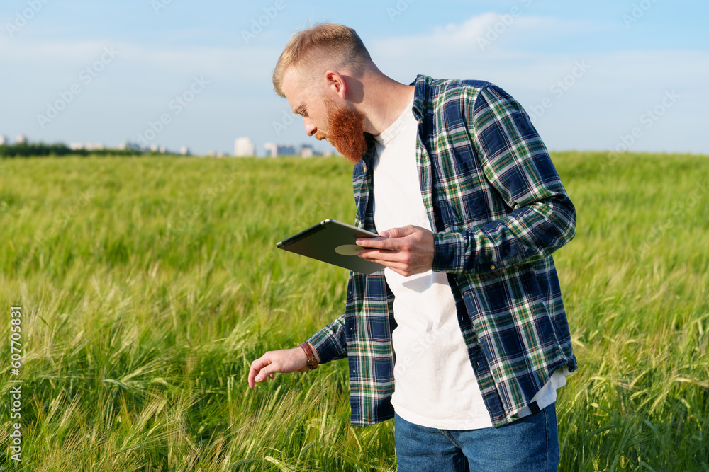 A young male farmer with a tablet is standing in a wheat field. An agronomist during a crop inspection. Eco-friendly products