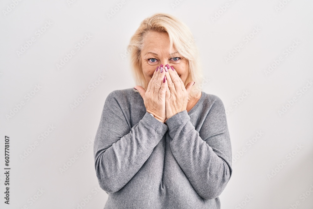 Middle age caucasian woman standing over white background laughing and embarrassed giggle covering mouth with hands, gossip and scandal concept