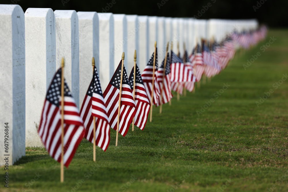 Memorial Day flags placed at headstones of American veterans who are buried at National Cemetery